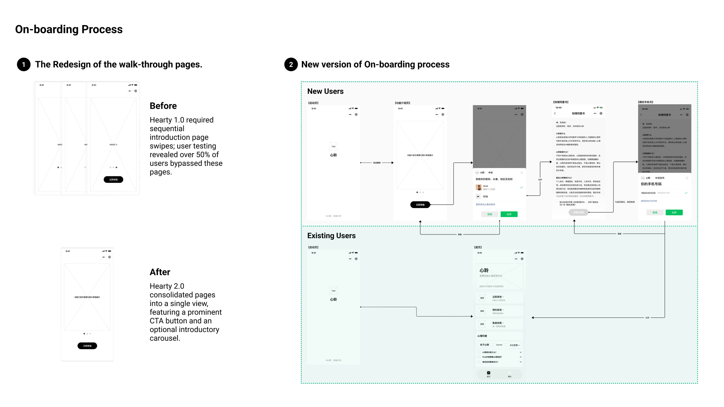 I streamlined Hearty 2.0’s onboarding by combining walkthrough pages into a carousel, adding a prominent Call-to-Action button, and redesigning the visuals to provide a pleasing experience.