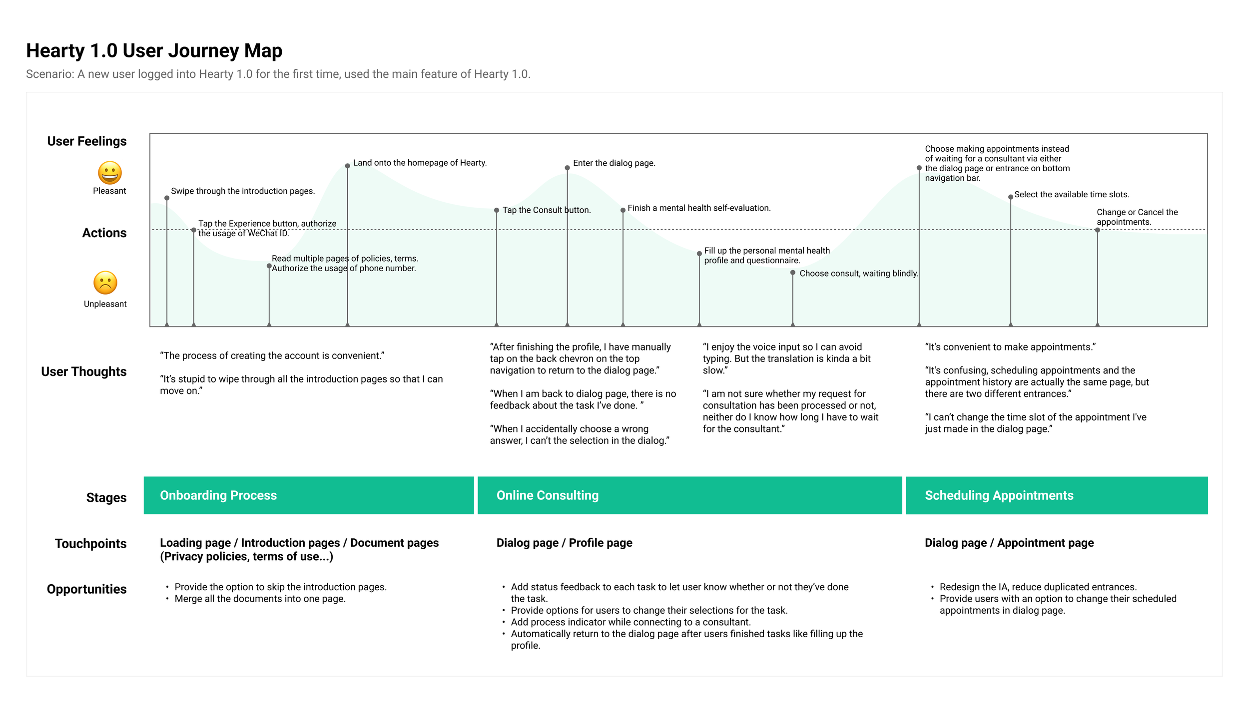 I identified users’ pain points and prioritized the issues through user interviews with 6 users (three new users and three existing users). I found the barriers that users were facing in the three major features and created a user journey map of Hearty 1.0 based on the data collected from the interviews.